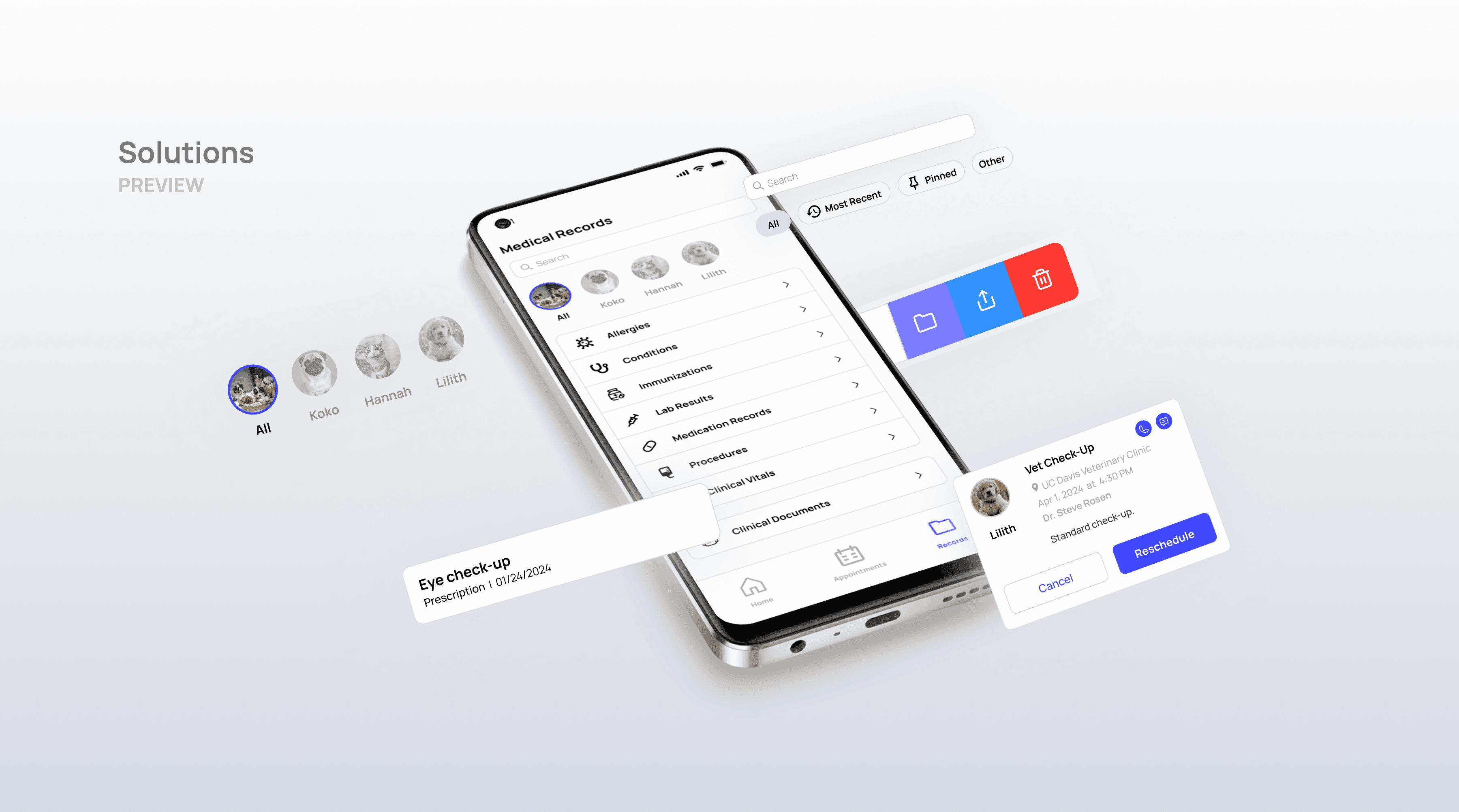 Both you and your veterinarian can update records. Sort through documents like diagnoses, prescriptions, and vaccinations.
