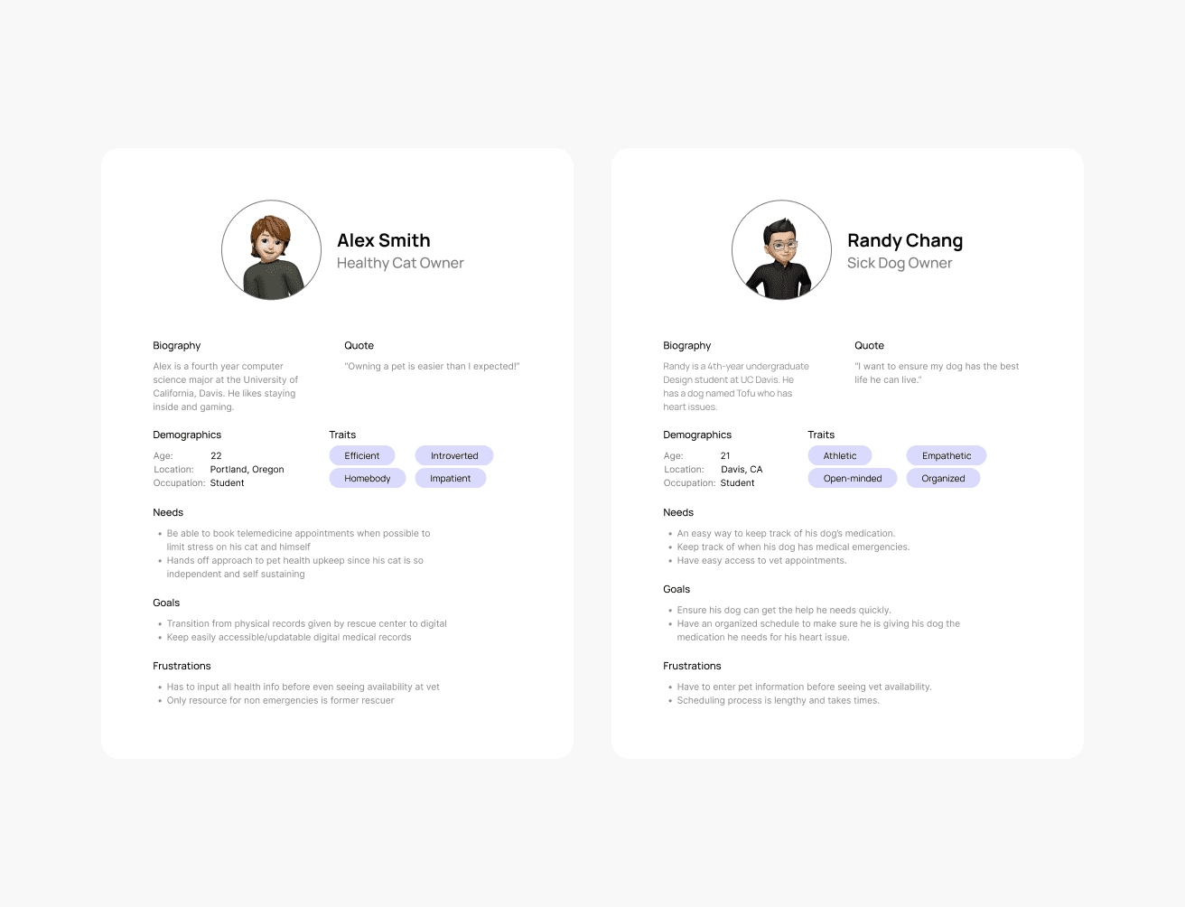 Meet Alex, an introverted university student with a healthy cat of 3 years. Alex prefers being able to book telemedicine appointments when possible to limit stress on his cat and himself.
