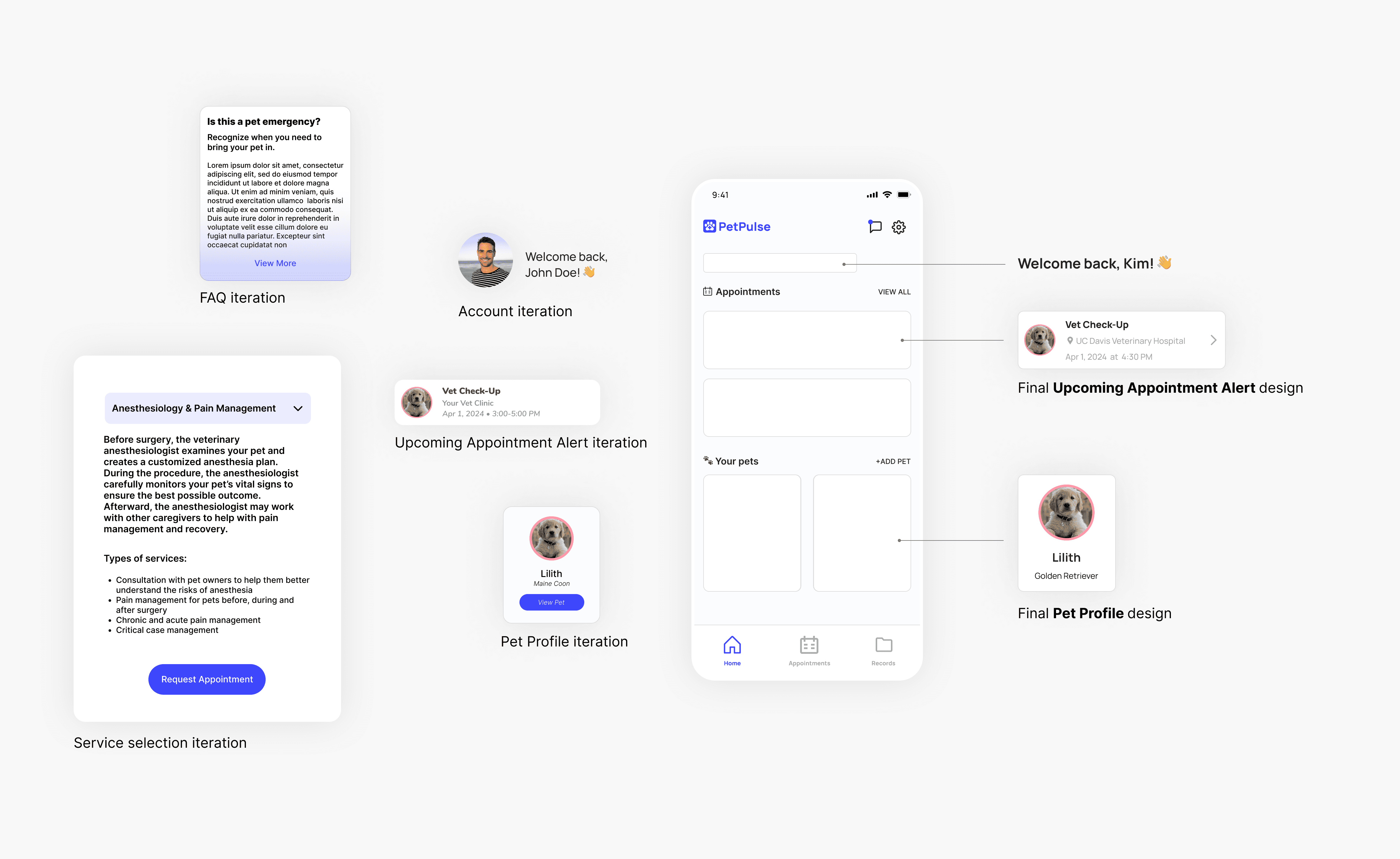 The home page acts as a central hub where users can view upcoming vet appointments, directly message veterinarians, and manage their pets’ profiles.