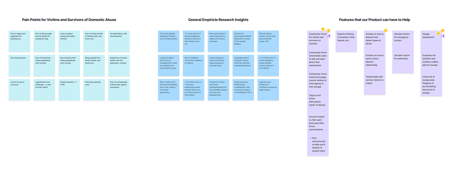 I synthesized user pain points—such as fear of discovery, dependency, and post-abuse trauma—alongside insights showing that many survivors don’t label their experiences as abuse or know help is available.