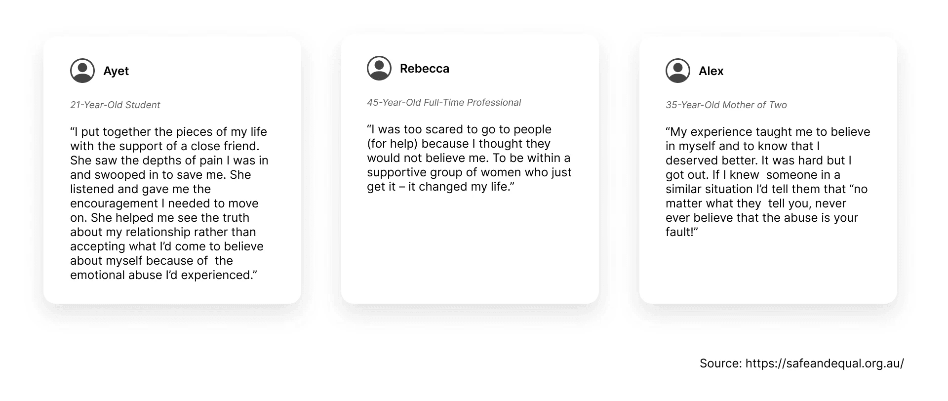 I sourced testimonies from survivors published by support organizations and online campaigns.